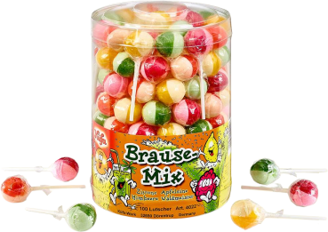 Küfa Brause Mix Lollis in versch. Geschmäcker mit Brause 4/s (Zitrone, Apfelsine, Himbeere, Waldmeister) in 100er Dose